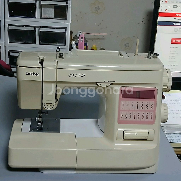 부라더미싱. 베이지색 바디에 핑크 컬러의 디지털 패널이 있어서 깔끔하고 예뻐요. 작동잘됩니다 상태 양호하니 재봉 취미나 작업용으로 좋을 것 같아요!