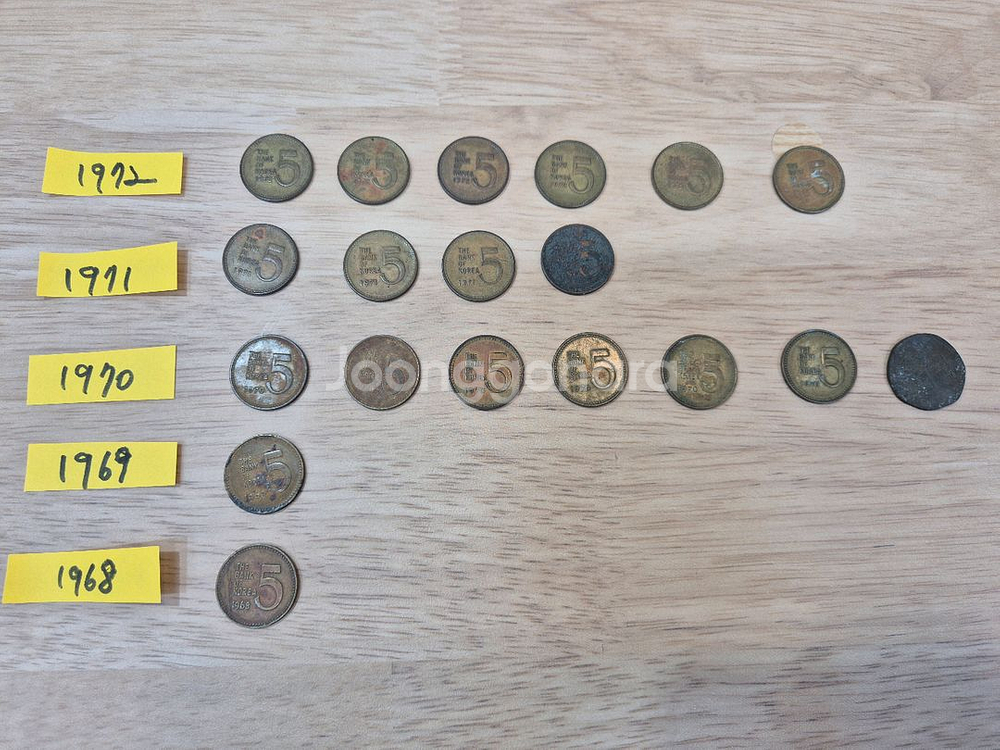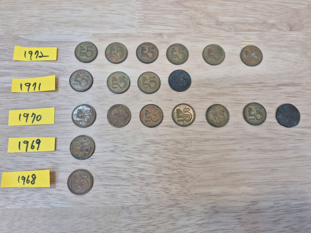 옛날 5원 동전 19개 일괄 판매합니다 -구성: 1968년(1개), 1969년(1개), 1970년(7개), 1971년(4개), 1972년(6개) - 총 19개 -상태: 사진과 같이 세월의 흔적은 있으나 연도 식별이 뚜렷한 사용제입니다. -특징: 수집 시작하시는 분들이나 카페 인테리어용, 소장용으로 좋습니다. 연도별로 정리해 두어 바로 소장하시기 편합니다.