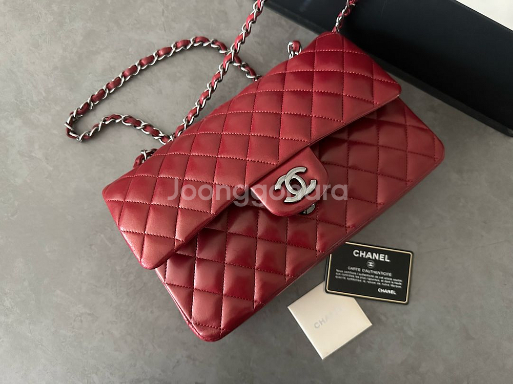 샤넬 램스킨 클래식 미듐 체인 숄더백 사이즈: 25.5 컬러: 레드/ 은장 부속품: 박스, 더스트, 개런티카드, 영수증 매장가: 1660만 작년 크루즈에 다시 나왔던 레드 컬러입니다. 15번대 실착 횟수 적은 편으로 뒤쪽에 자연스러운 착용흔적외에(사진참고)양호한 컨디션입니다. 중고 특성상 반품 정중히 거절하오니 신중히 구매 해 주세요.^^ 직거래는 대전 세종입니다