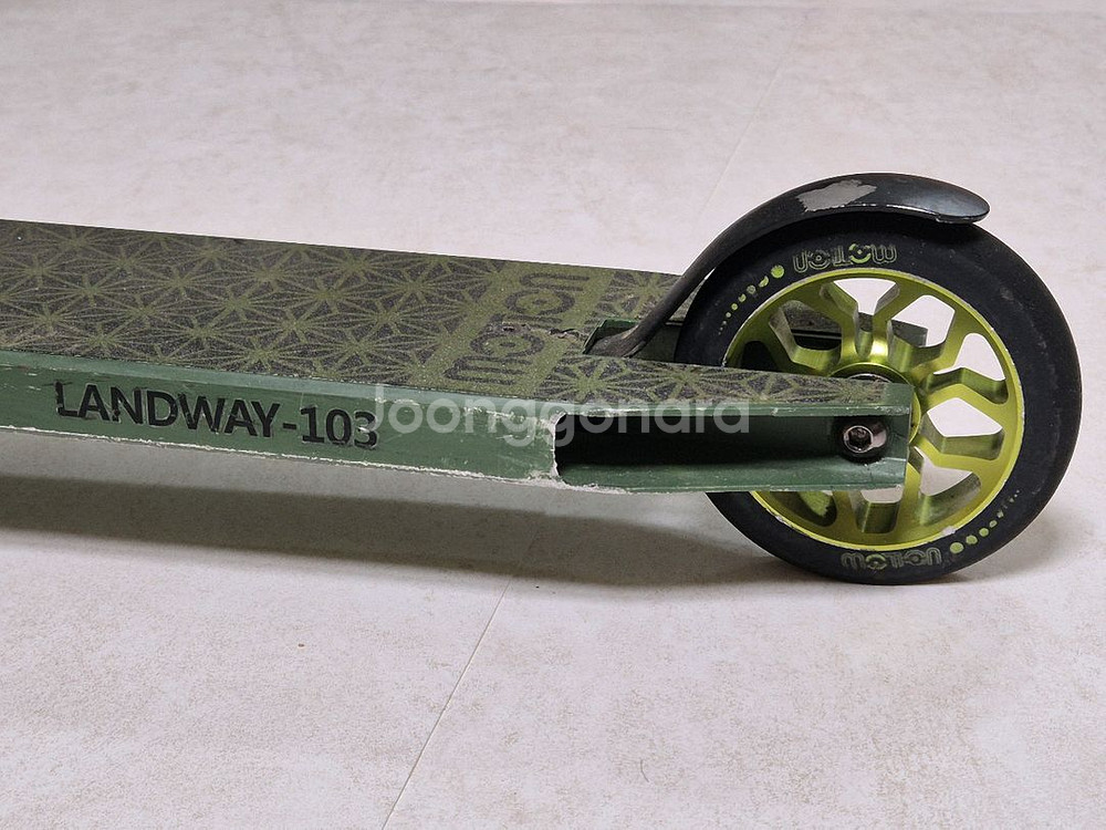 모션 랜드웨이 103 MOTION LANDWAY 103 스턴트스쿠터 킥보드 + 킥보드 스탠드(거치대) 지면에서 핸들바까지 높이 81cm 베어링 셋팅돼있고 유격없음. 기능이상 없음. 앞휠은 저렴한걸로 교체돼있습니다. 기타 상태는 사진참고해주세요. 직거래는 서울 강남. 택배 배송시에는 핸들바 분리해서 보냅니다.