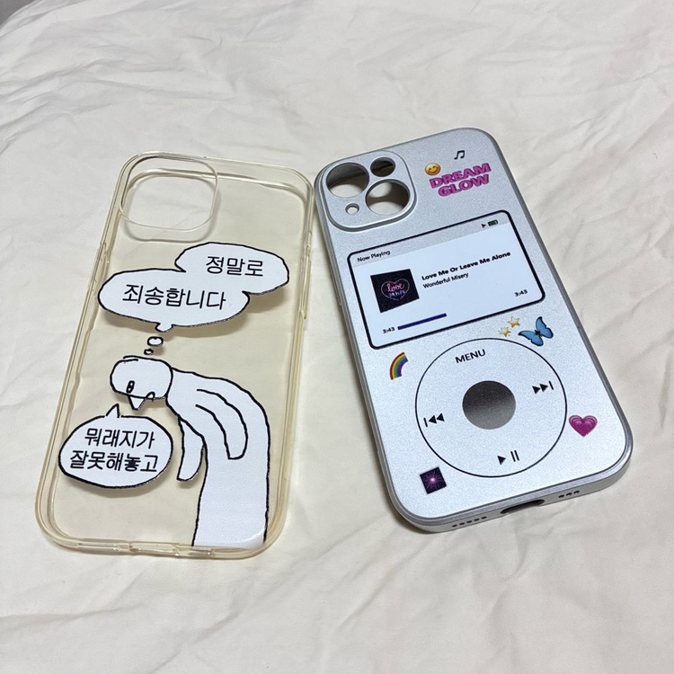 아이폰 15용 케이스 2종 일괄 판매합니다. 1. '정말로 죄송합니다' 닝구 케이스 (투명) 2. 실버 아이팟 뮤직 플레이어 케이스 - 상태 : 둘 다 실내에서 시착만 1회 해본 후 바로 지퍼백 보관 중인 S급 상품입니다. - 특징 : 변색이나 스크래치 전혀 없고 사진 보시다시피 아주 깨끗해요. - 기종 : 아이폰 15 (프로/플러스/프맥 아님) 기분 전환용으로 쓰기 딱 좋은 힙한 디자인들입니다! 일괄로 저렴하게 가져가세요. 문의 없으시면 바로 안심결제 가능하며, 택배 당일 접수 진행합니다.