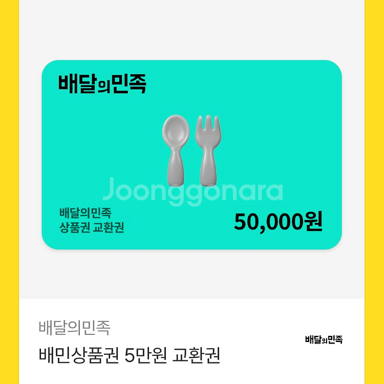 개인정보(거래정보)를 주고받는 행위는 사기에 노출될 수 있으므로 즉시 중고나라로 신고해 주세요배달앱에서 사용 가능한 5만원 상품권이에요. 유효기간 확인하시고 구매해주세요! 유효기간 2027년 3월 26일