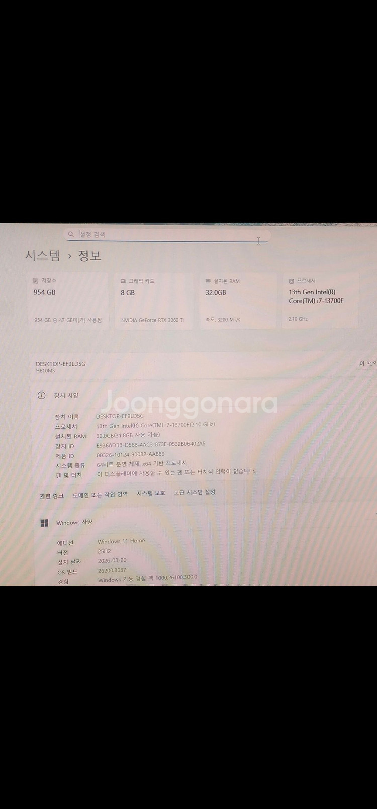 고성능 CPU와 최신 그래픽카드가 탑재된 게이밍 PC입니다. RGB 쿨링팬과 깔끔한 화이트 케이스로 구성되어 있어요. 상태 양호하고 바로 사용 가능합니다. 인텔 i7 13700f 메모리 ddr4 32gb(16X2) 삼성 2023년 생산 제품입니다. pc4-3200 그래픽카드 rtx3060ti 8g 화이트 모델 ssd nvme 1tb 메인보드 h610m 판매가격 118만원 입니다. 사용기간 약 1년 (사용하질 않아 판매합니다.)