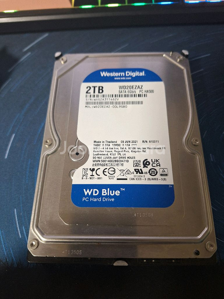 WD Blue 2TB HDD (WD20EZAZ) 입니다 - 모델명: WD20EZAZ - 용량: 2TB - 인터페이스: SATA 6Gb/s - PC HA500 CrystalDiskInfo 결과, 상태 양호합니다.