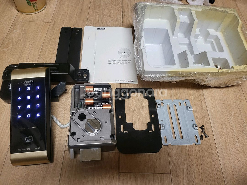 게이트맨 ASSA ABLOY WV-41 디지털 도어락입니다 구성품은 사진에 보이는 것과 같이 모두 포함되어 있습니다 튼튼하고 안전한 디지털 도어락으로 지원하여 편리하게 사용 가능합니다 사용감은 찾아볼수없구 기스도없습니다 타공설계도면 있으며 창고나 화장실에 현관문에 적합합니다 작동확인겸 비번1234 마추어났으며 비번교체시 열림상태에서 R누르시고 숫자입력뒤 알누르시면 됩니다 직거래는 서울 성북동입니다 건전지 포함이며 포장도 꼼꼼포장 합니다