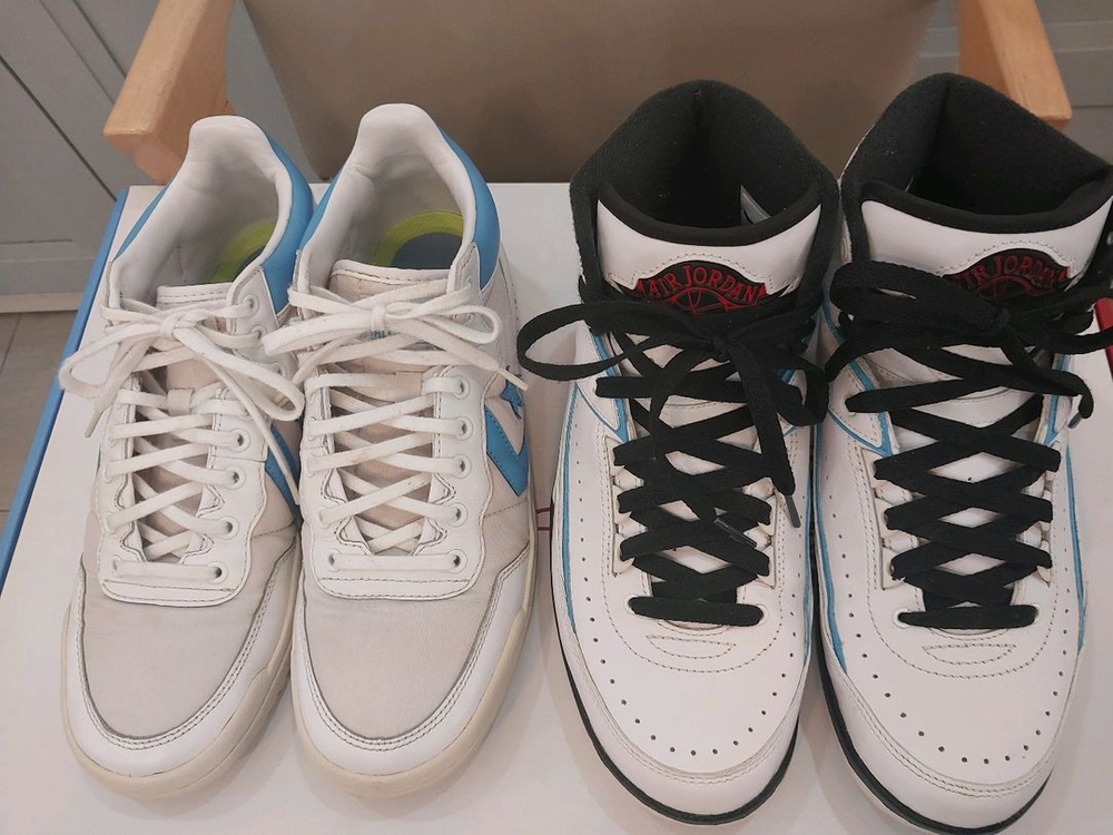 나이키 조던2 컨버스 팩 Converse Pack Alumini 품번 917931-900 2족 풀 패키지 남성용 250사이즈 택포 7만5천원입니다 (가격다운) 조던2는 엔젤러스 페인트로 간단한 커스텀 했습니다 (마지막 사진 2장 참고바랍니다) 컨버스는 밑창과 외피 황변 조금 있습니다