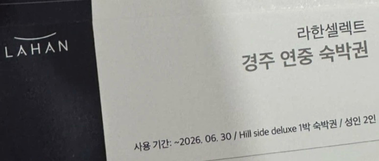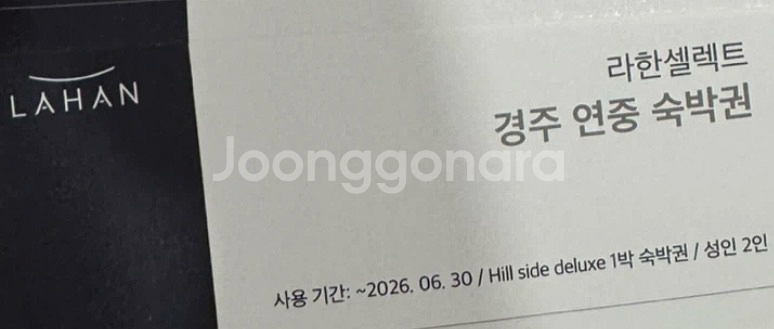 개인정보(거래정보)를 주고받는 행위는 사기에 노출될 수 있으므로 즉시 중고나라로 신고해 주세요경주 라한 셀렉트 호텔 숙박권이에요. 주말 사용 가능하고 사용기간은 2026년 6월 30일까지고 , 조식포함 Hill side deluxe 1박 숙박권입니다. 가시는 날짜 미리 전화 해보고 문의 바랍니다