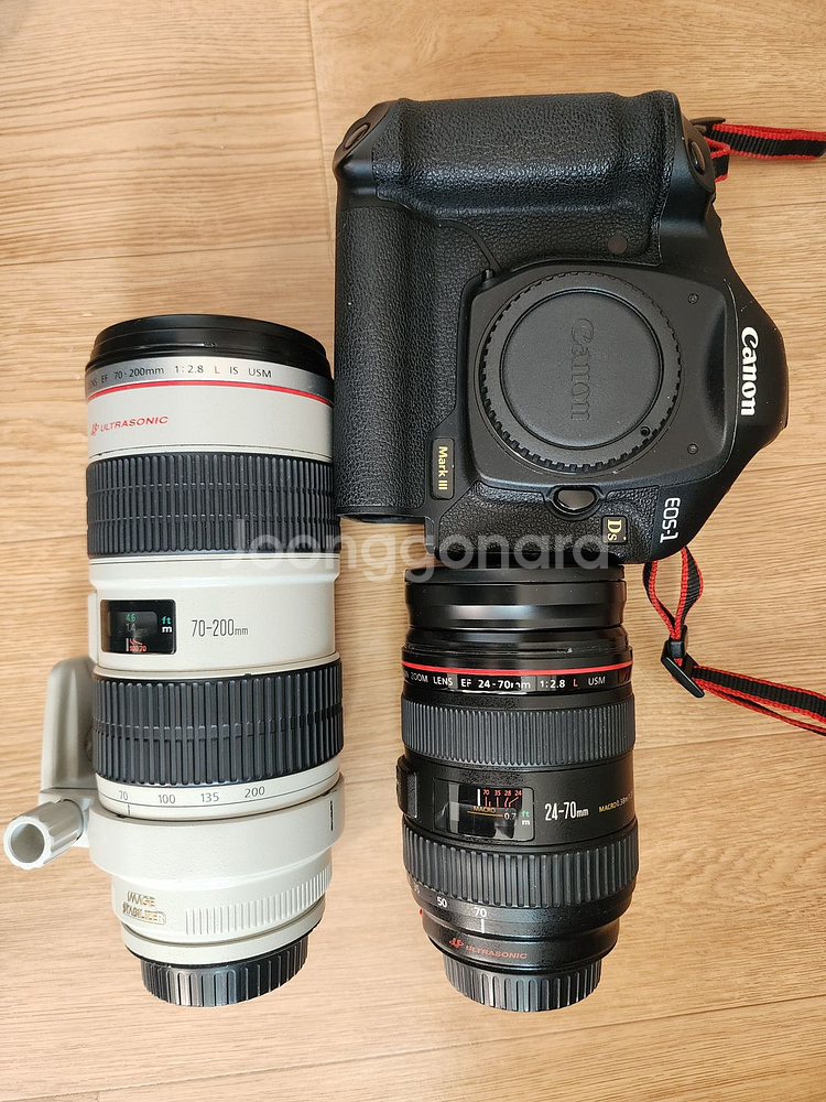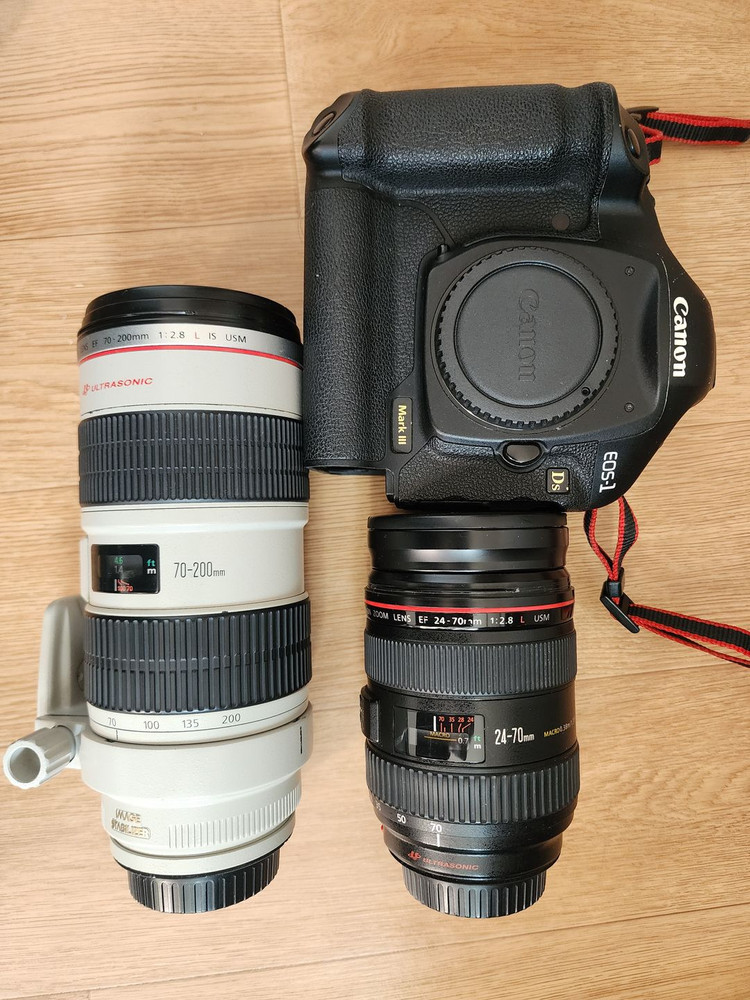 DSLR 카메라 바디와 70-200mm 망원렌즈, 24-70mm 마크로렌즈가 포함된 세트입니다. 배터리 충전기도 함께 드려요. 사용감은 있지만 정상 작동하는 상태입니다. 1ds mark3, 24-70렌즈, 70-200렌즈 세트 판매입니다. 중고품 구입 후 몇번 사용않았습니다. 010-5661-0146 문자 부탁드립니다.