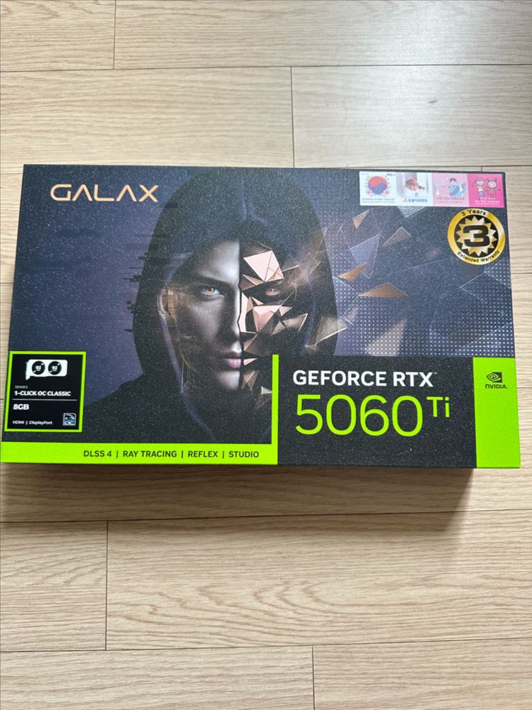미개봉 새상품 rtx5060ti 8gb 갤럭시 블랙 그래픽카드 판매합니다 하급기 아니고 as좋은 갤럭시 제품입니다 3/26수령, AS 3년 가능합니다 중고말고 AS빵빵하게 남은 새상품 저렴하게 가져가세요! 거래내역 다수 있습니다