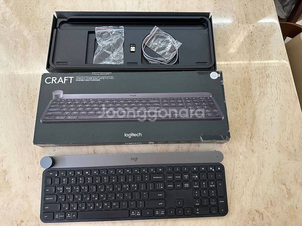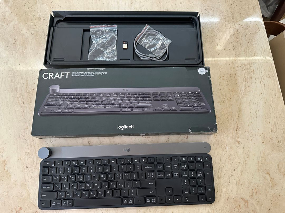 로지텍 CRAFT 무선 키보드입니다 정가 28만원 제품 - 박스, USB 수신기, 케이블 포함 - 정교한 입력 다이얼로 창작 작업에 최적화 - 창작 작업에 필요한 바로 가기 기능에 즉시 액세스 가능 - 알루미늄으로 제작되어 견고하고 고급스러운 디자인 사용감 있습니다.