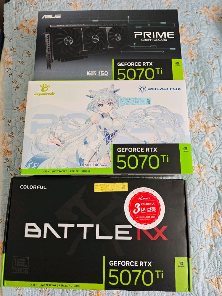 ASUS RTX 5070Ti 프라임 Prime (미개봉) - 138만 컴퓨존 구매. 보증기간 29년 11월까지 Manli RTX 5070Ti 폴라폭스 Polar Fox (미개봉) - 143만 컴퓨존 구매. 보증기간 29년 1월까지 Colorful RTX 5070Ti 토마호크 (중고상품) - 128만 컴퓨존 2차구매. 보증기간 28년 9월까지 (외관 및 성능 하자 전혀 없습니다) 수원 광교에서 직거래 또는 선입금 택배거래로 거래합니다. 안전거래는 하지 않습니다.