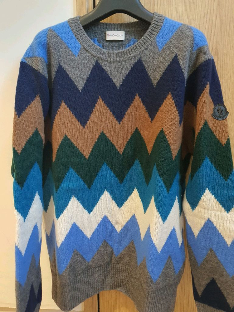 몽클레어 남성 니트 스웨터 판매합니다. 독특한 패턴이 눈에 띄는 제품입니다. 100% 울 소재로 고급스러움을 더했습니다. 사이즈는 XL 이고, 구매 후 3회미만 착용으로 새상품급 컨디션 입니다!