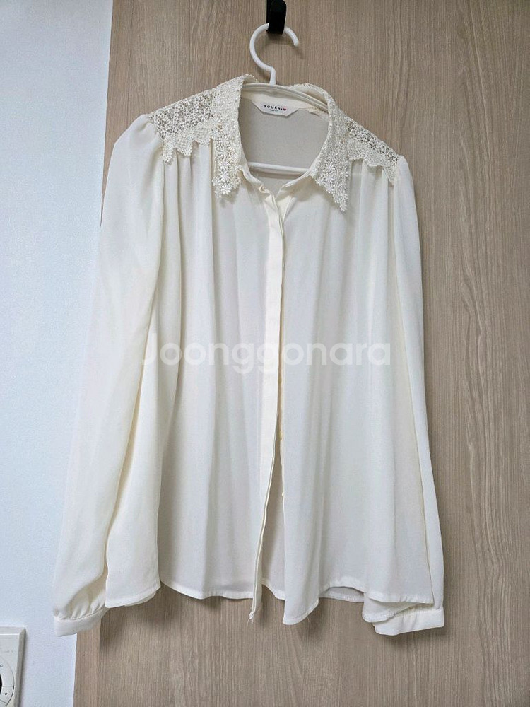 YOUKKI 브랜드의 아이보리색 블라우스입니다~ 가슴단면 54cm, 총장 56~58cm정도라 77까진 이쁘게 입으실 듯 해요. 레이스 디테일이 포인트로, 부드러운 소재로 제작되어 착용감이 좋습니다. 상태 좋아요.
