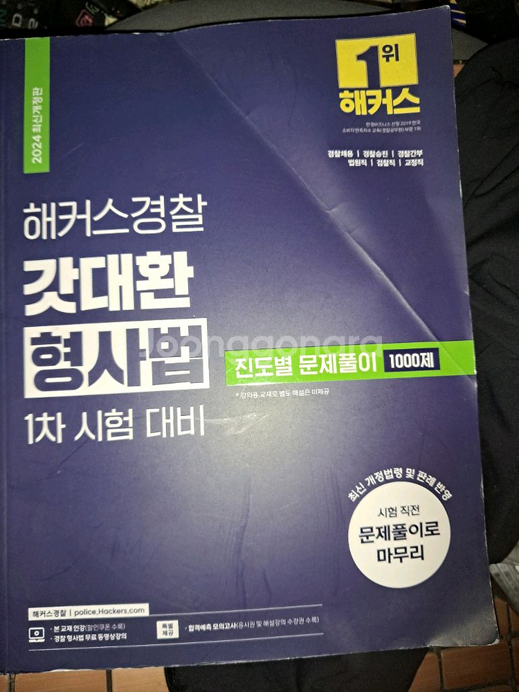 2024년 해커스경찰 간대환 형사법 대비용 교재입니다. 1차 시험 대비용으로 문제풀이 1000제가 포함되어 있어요. 사용감은 있지만 공부하기에는 문제없는 상태입니다.택배처리에필요한사항(박스에기재할주소등) 은사진으로보내주시면확인후 최대한빠른시간안에 전주진북동우체국에서 택배후 운송장보내드릴게요.