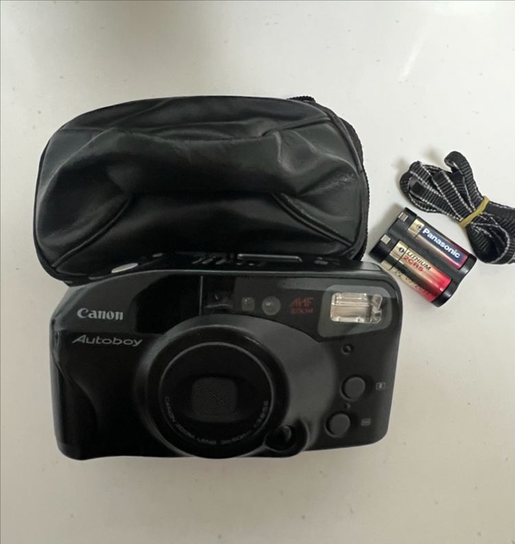 모델명: 캐논 new autoboy 구성품: 본체 + 파우치+스트랩+ 2CR5배터리 포함 캐논의 캡션,줌기능이 있는 뉴오토보이 필카 입니다! 5가지 캡션기능과 데이터백도 29년까지 가능하여 빈티지한 느낌의 필름사진찍기에 유용한 제품입니다 사진처럼 뷰파인더및 본체 전체적으로 깨끗하며 플래시.타이머등 모든기능 정상작동 하여 바로 사용가능합니다 !
