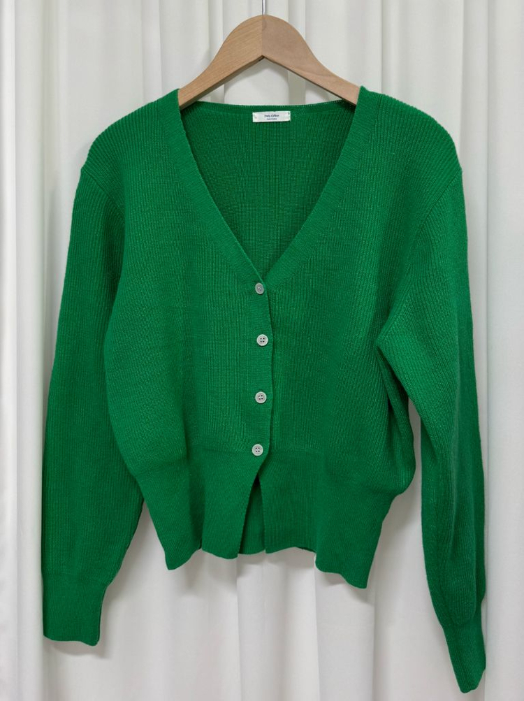 색상이 너무 예쁜 비비드 그린 색감의 브이넥 가디건입니다. 내수상품이라 소재감도 부드럽고 밑단 트임 디자인이라 날씬해보이는 효과를줍니다 ^^ 옷 컨디션도 좋고 지금부터 쭉 입기 좋으세요. ✅실측 가단50 총장 52정도 확인됩니다🥰