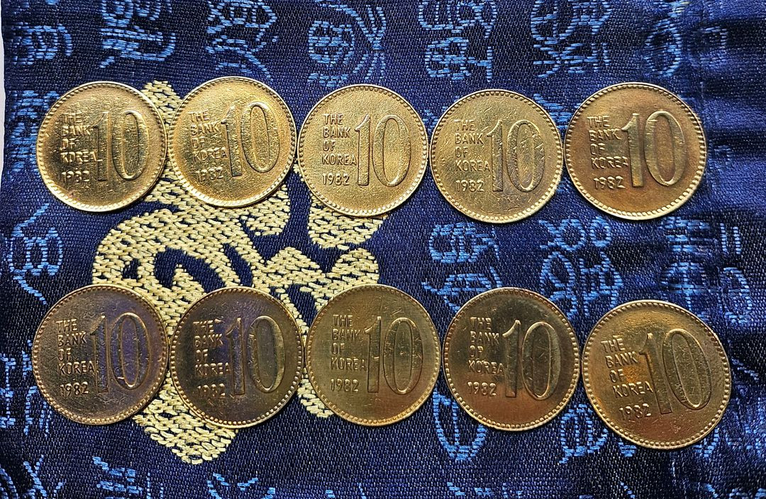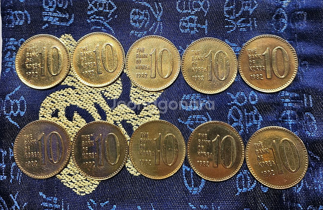 1982년에 발행된 10원 동전 10개 묶음입니다. 수집용으로 보관해 온 동전들이라 상태는 좋습니다. 사진 보시고 빈티지한 느낌 좋아하시는 분들은 연락주세요! 문의 없으시면 바로 안전결제해주시면 됩니다!