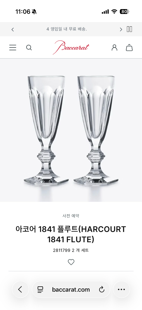 바카라 아코어 1841 플루트 샴페인잔입니다 개당 가격이고, 두개 사시면 40만원 해드립니다. 대한항공 퍼스트클래스에 제공되는 샴페인잔으로 유명하며, 한정판이고 풀박스 새상품입니다 25년 12월 중순에 받았습니다. 첨부사진처럼 정가로는 95만원에 판매하는 상품입니다. 배송은 파손위험이 어렵고 대구 경산에서 직거래만 거래하겠습니다.