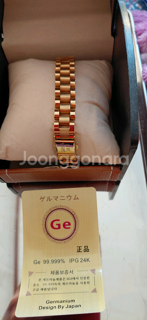 개인정보(거래정보)를 주고받는 행위는 사기에 노출될 수 있으므로 즉시 중고나라로 신고해 주세요 정품 보증서와 함께 깔끔한 상태로 보관되어 있습니다. 고급스러운 디자인의 골드 메탈 브레이슬릿이 정말 예뻐요!