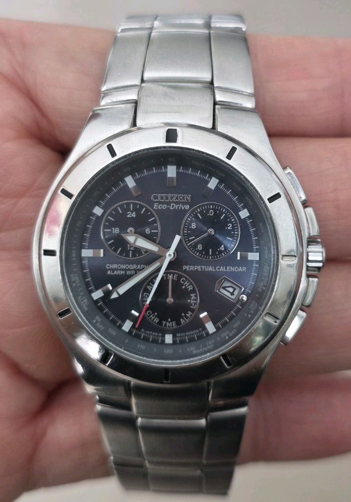 시티즌 (CITIZEN) 솔라 퍼페츄얼 에코드라이버 E819 고장 시계 시티즌 태양광 퍼페추얼 시계인데 지금은 멈추어 있는 제품입니다. 수리가 필요합니다. > 원산지 : 일본생산 쿼츠 > 에코드라이버 태양광원 > 퍼페츄얼 영구 달력기능 > 알람기능 장착 > 스테인레스 스틸 케이스 > 스테인레스 스트랩 > 케이스 직경 : 43 mm > 케이스 두께 : 10.0 mm > 방수 : 10ATM 100m ※ 크리스탈 유리에 흠 전혀 없고 사진과 같이 미한 생활감에 17.5 손목사이즈에 setting. 단 지금 멈춰있어 고쳐서 사용해야하며 시계단품으로 수리비용감안 저렴하게 판매합니다. 》택배거래시 일반+4.5천원, 반값+2.5천원 추가입금. (미입금 착불배송) 》저렴한 상품으로 교환, 환불 불가하며, 예민한분은 구매자제 바랍니다. # 팔로우 하신분 ♤Thanks!!
