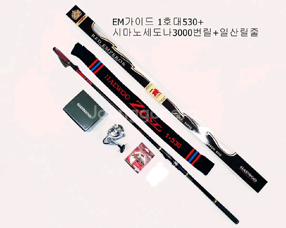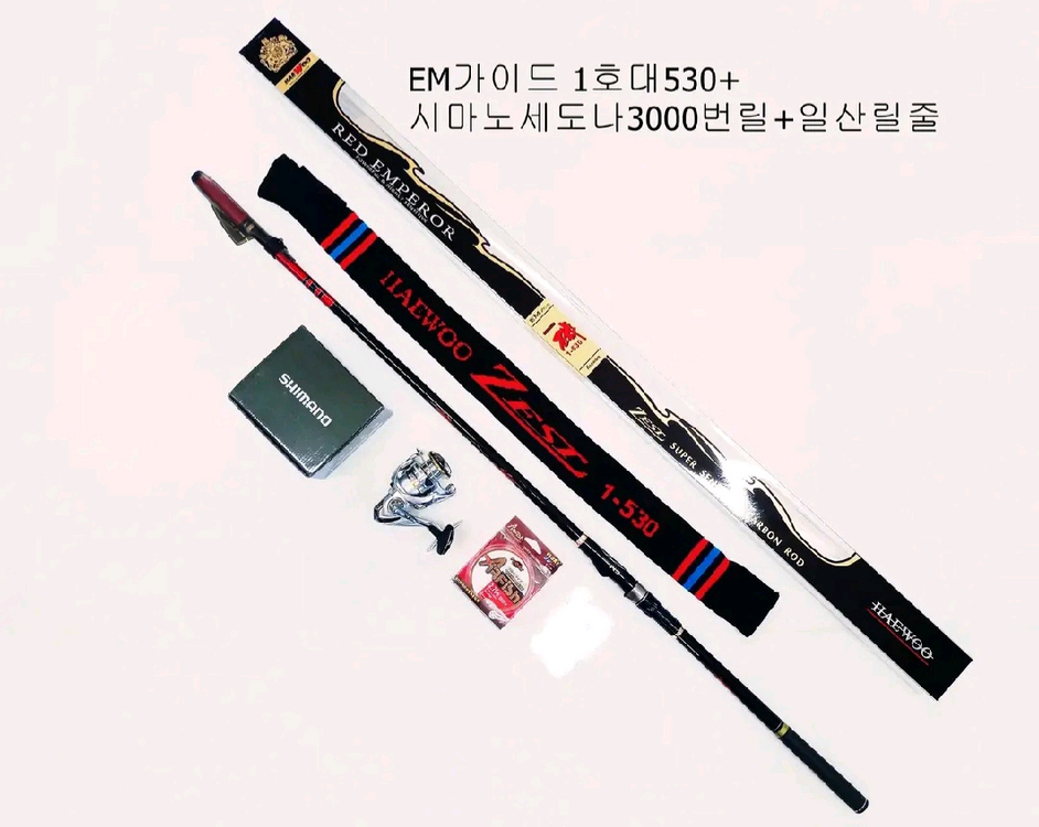 1, 낚시대 생산 전문업체 해우에서 생산한 "제스트기 1호-530"릴찌낚시대로서 EM가이드를 장착함으로서 모든 낚시에 줄빠짐이 원활하고 고급스러운 느낌을 연출하였으며 최고급 파워카본 채용으로 튼튼하면서 부드러운 느낌을 선사합니다. 모든 마디마다 가이드라인및 줄붙음방지 공법을 채용하였고 고급스럽고 편리한 회전형 릴시트에 EM가이드에 맞는 고급형 가이드캡을 채용하였으며 고급 스판보관집을 증정합니다. 5마디에 접은길이 117cm, 펼친길이 5.3m, 선경0.7mm, 원경22.7mm, 자중189g, 추부하1~3호, 카본함량 95%입니다. 2, 시마노 세도나 3000번릴로서 윤성정품이고 보증서를 제공해 드리며 구매후 1년내 1회에 한해서 무상 AS가 가능합니다. 기어비 6.2;1, 자중245g, 4볼베어링이며 핸들은 좌우 쉽게 교체 가능합니다. 3, 원줄은 일산제품 플로트타입 8공사 150m이며 완전 평행사로 줄꼬임을 줄였습니다. 바다갯바위낚시, 선상낚시, 찌낚시등 두루 사용 가능하고 2호대도 구매 가능하며 15000원 추가됩니다. 모두 미사용품이고 택배비 부담해 드리며 다량주문도 가능합니다 010 5953 4450 입니다
