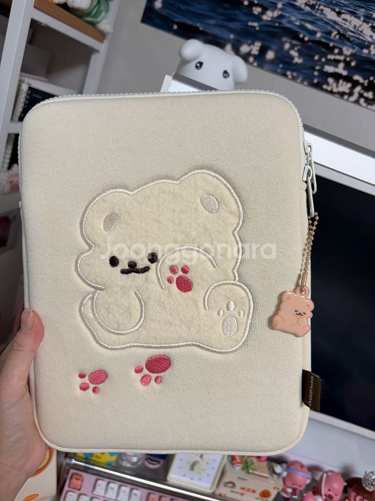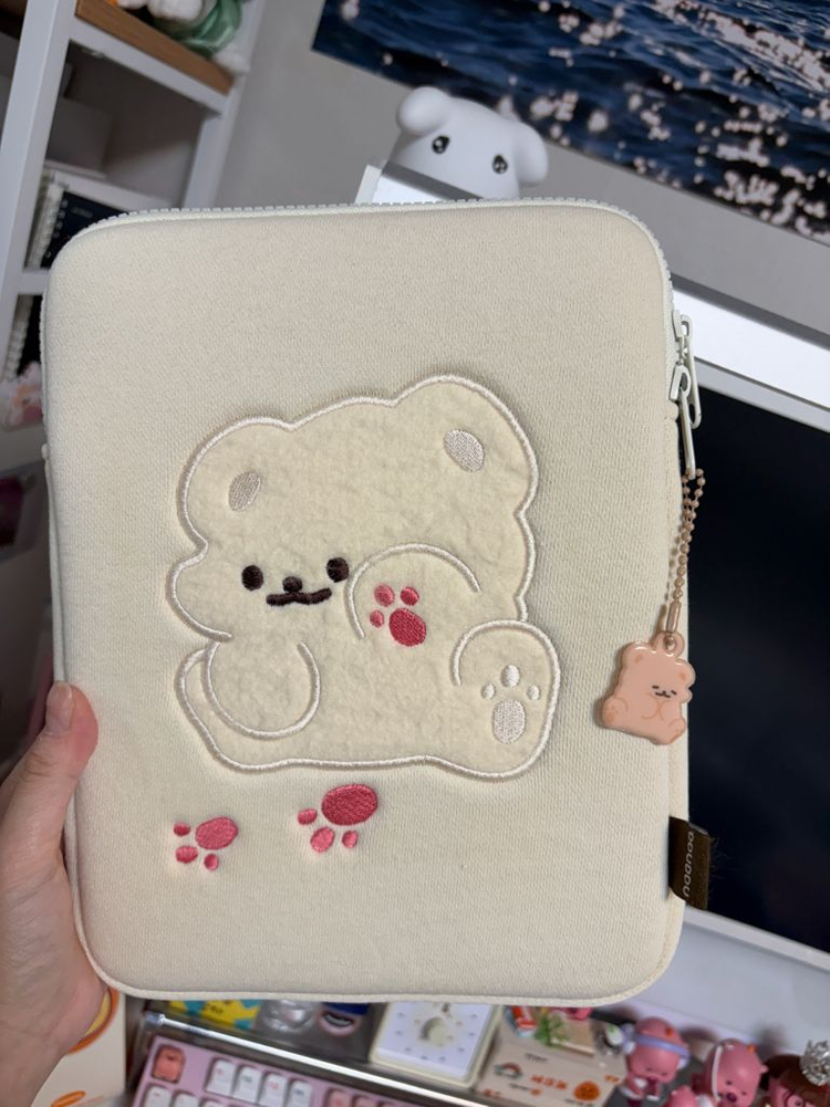 아이패드 11인치 뚜뚜상점 파우치입니다. 아이보리 색상에 귀여운 곰돌이 자수가 놓여있습니다. 곰돌이 키링도 달려있어 포인트를 더했습니다. 세탁했고 사용했던거라 예민하신분은 피해주세요 반택 +2,000