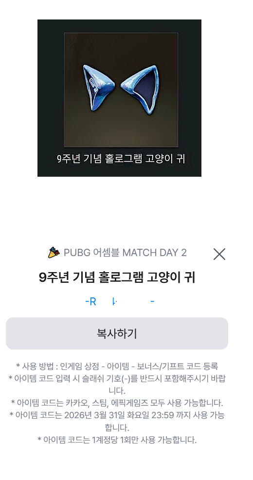 개인정보(거래정보)를 주고받는 행위는 사기에 노출될 수 있으므로 즉시 중고나라로 신고해 주세요배틀로얄 게임 매치데이 9주년 기념 한정 아이템인 홀로그램 고양이 귀예요. 블루 컬러의 홀로그램 효과가 있는 귀 모양 아이템으로 게임 내에서 사용 가능합니다.