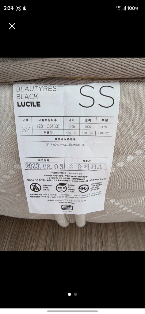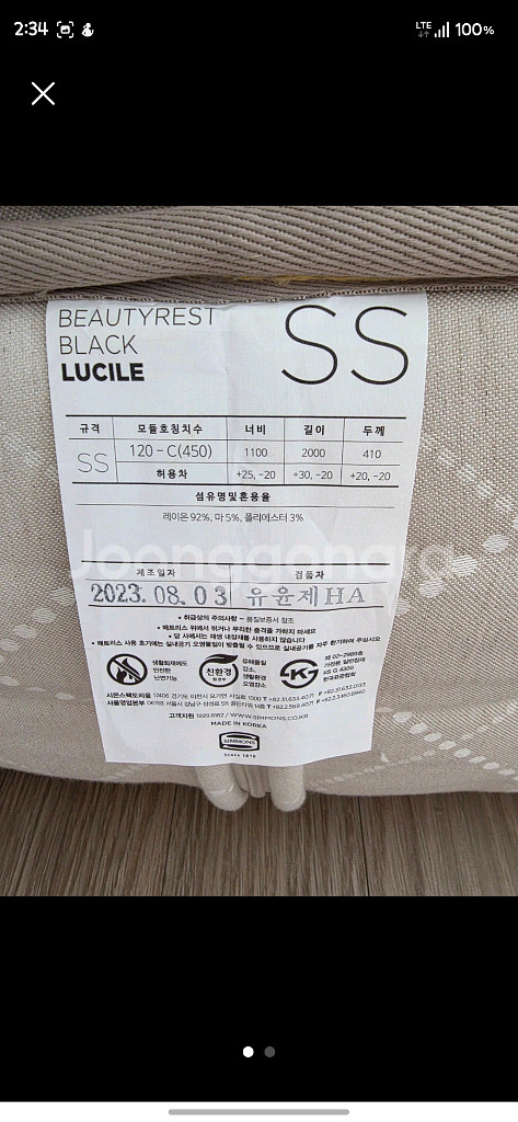 시몬스 뷰티레스트 LUCILE SS 매트리스입니다 23년 8월 3일에 제조되었고, 너비 1100mm, 길이 2000mm, 두께 410mm입니다 레이온 92%, 마 5%, 폴리에스터 3% 혼용률입니다. 저는 2차구매자이고 프레임은 새로 산겁니다. 프레임 사고 사용해봤으니 저는 3일 썻네요. 매트리스가 푹신한 편이라 호텔 침대같은 느낌입니다 프레임은 필요하시면 가져가셔도되고 매트리스만 가져가셔도 됩니다. *선입금 우선판매합니다. *용달비는 구매자 부담입니다. *중고 거래이므로 환불 불가합니다. *고가의 물건이므로 직접 와서 보고 구매하시길 추천합니다.