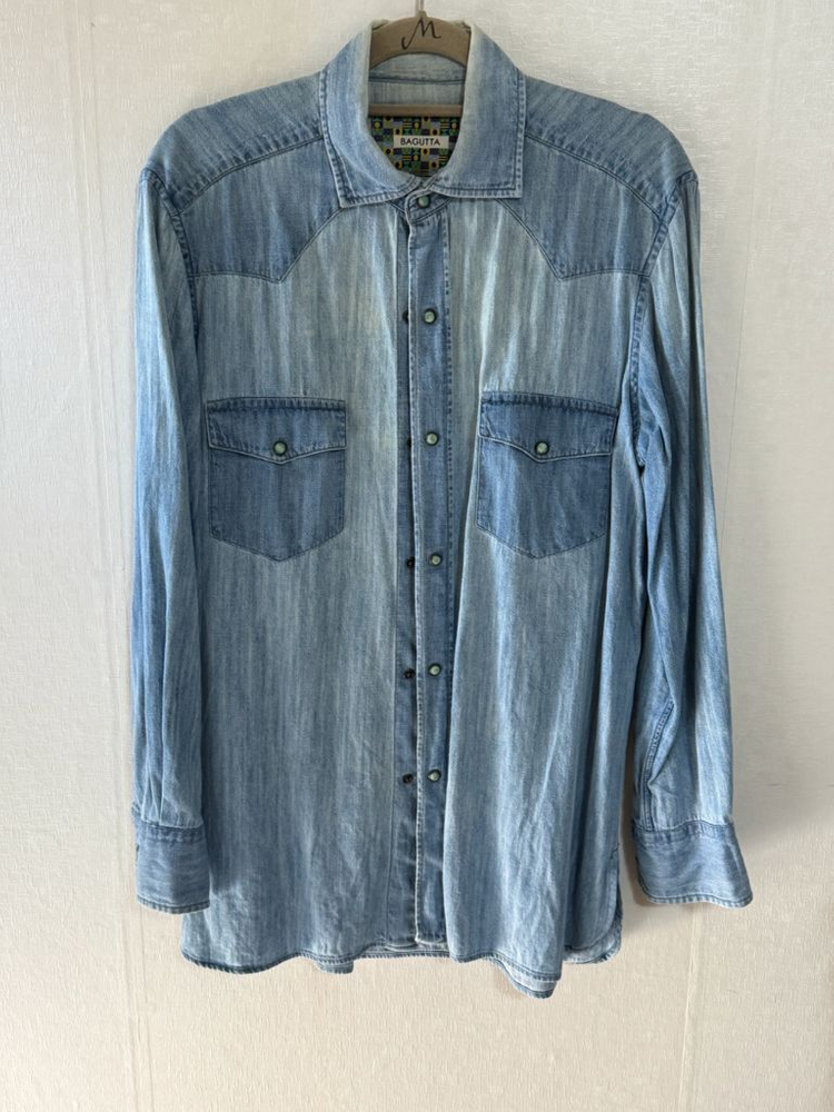 어깨 가슴 소매 총장 44 53 60 76 이탈리아의 셔츠 전문 브랜드인 바구타의 웨스턴 셔츠입니다. 옥색의 단추와 길쭉하게 뻗는 워싱감이 시원해보이는 데님입니다. 두께감은 한 여름제외하고 입을 수 있는 두께감입니다. 상태는 사진 확인 부탁드리겠습니다. 이사로 인해 정리 중입니다. 물건이 많아 미처 발견하지 못한 오염이 있을 수 있어서 세탁비를 감안하여 가격 책정하였습니다. 판매 제품은 모두 정품이니, 정품문의와 더불어 실착 사진 요구는 자제해주시면 감사하겠습니다. *최대한 정확하게 실측하였으나, 1~2cm 오차가 있을 수 있습니다.
