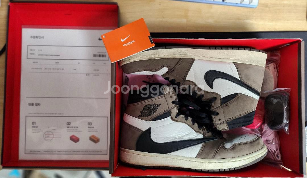 개인정보(거래정보)를 주고받는 행위는 사기에 노출될 수 있으므로 즉시 중고나라로 신고해 주세요조던 트래비스스캇입니다 실착횟수 적고 밑창상태 깔끔합니다 여분끈,나코탭,구매증명서,박스,비닐 모두 보유중입니다 완벽한 풀박스입니다 빠르게 판매합니다