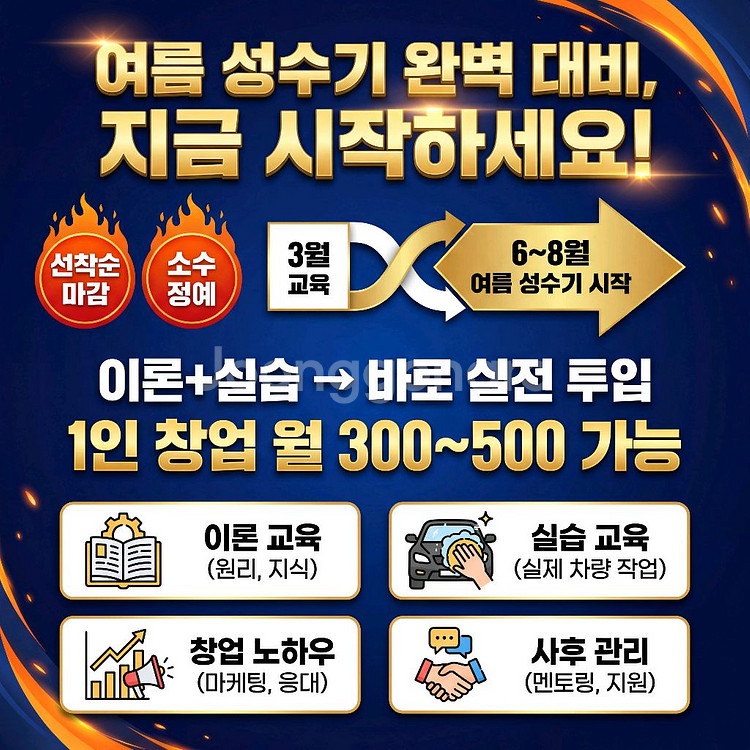 엠씨케이광택과 함께 성공 창업의 기회를 잡으세요! 체계적인 시스템으로 검증된 자동차 광택 사업, 이제 당신의 지역에서 시작하세요. 왜 엠씨케이광택인가? 혼자서는 막막한 창업, 엠씨케이광택과 함께라면 다릅니다. ✅ 전문 창업교육 제공 - 업계 노하우를 체계적으로 전수 ✅ 검증된 운영 시스템 - 홍보부터 매장관리까지 A to Z 지원 ✅ 지속적인 파트너십 - 오픈 후에도 든든한 경영 컨설팅 ✅ 마케팅 노하우 공유 - 고객 유치의 핵심 전략 제공 현재 모집 중인 지역 우선 추천 지역 경기 북부 (의정부, 남양주, 구리,파주,김포, 양주, 동두천 등) 충청권 (천안,아산, 당진, 청주, 세종, 대전 등) 선착순 마감될 수 있으니 서둘러 주세요! 이런 분들께 추천합니다 안정적인 자영업을 찾고 계신 분 자동차 관련 업종에 관심 있으신 분 체계적인 지원 시스템 하에서 창업하고 싶으신 분 지역 기반 사업으로 장기 수익을 원하시는 분 엠씨케이광택이 제공하는 것들 교육 & 트레이닝 전문 기술부터 고객 응대까지, 실전 중심의 창업교육 운영 노하우 수년간 쌓아온 매장 운영의 모든 것을 공유 마케팅 지원 온·오프라인 홍보 전략 및 실행 지원 지속 관리 오픈 후에도 꾸준한 피드백과 개선 방안 제시 지금 바로 문의하세요! 특히 경기 북부 및 충청권 지역에 계신 분들의 많은 관심 바랍니다. 성공 창업의 첫걸음, 엠씨케이광택과 함께 시작하세요. 망설이면 기회는 다른 분께 넘어갑니다! 💬 상담 문의 환영 | 지금이 최적의 타이밍입니다 ※ 지역별 선착순 모집이며, 조기 마감될 수 있습니다. 네이버카페: https://cafe.naver.com/ttkakacokr?tc=shared_link