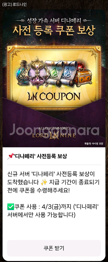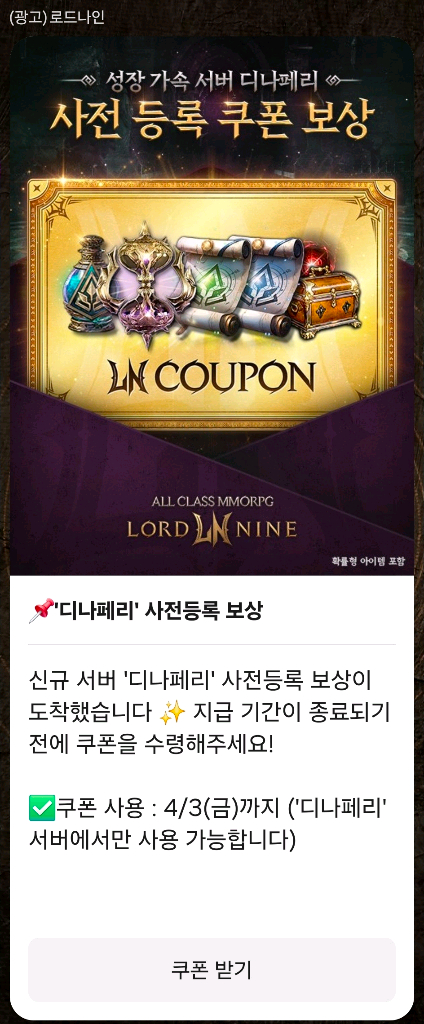 1.사전등록쿠폰 -검은오르 200개 -골드 5천만원 -중급승급서 30개 -숙련승급서 30개 -찬란한오르페의축복 20개 -어빌리티 성장 가속영약 20개 2.친구전용 월간쿠폰 -골드 100만 -무기강화석 10개 -방어구강화석 10개 -장신구강화석 10개 -검은오르 20개 -숙련승급서 5개 -엘세라음식상자 20개 -숫돌선택상자 20개