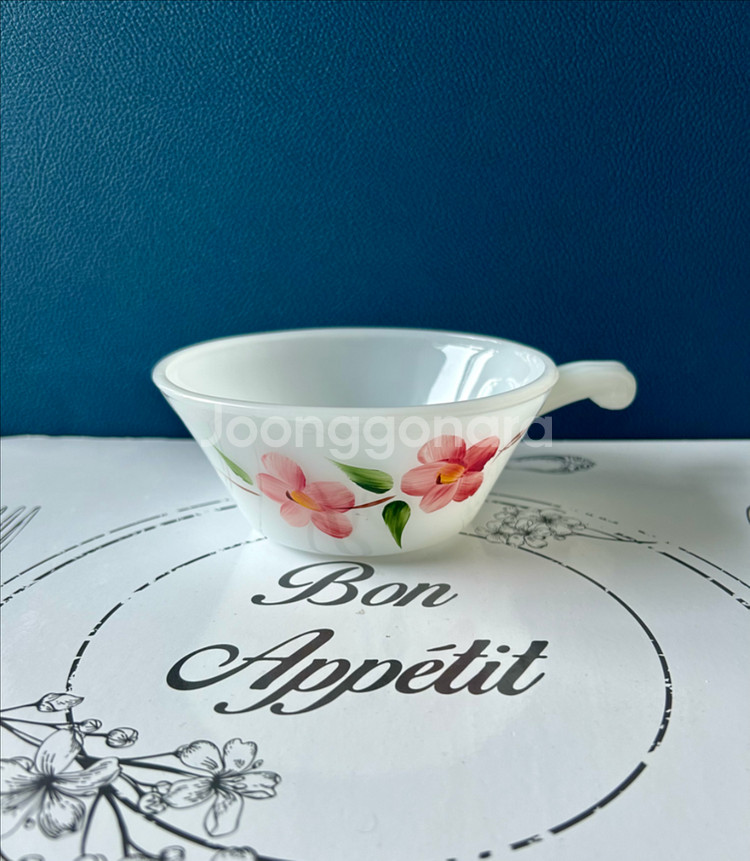 1950년대경 미국에서 생산된 앵커호킹(Anchor Hocking)사의 파이어킹(Fire-King) 피치 블로섬(Peach Blossom) 라인 밀크글라스 핸들볼입니다. 이 제품의 꽃 무늬는 텍사스의 '게이 파드 스튜디오(Gay Fad Studios)'와의 협업을 통해 장인들이 핸드 페인팅으로 직접 그려 넣었습니다. 수작업 특성상 제품마다 그림의 색감이나 위치가 조금씩 다를 수 있는 것이 특징이에요~^^ 특히 분홍색 꽃이 그려진 '피치 블로섬' 패턴은 수집가들 사이에서 인기가 높다고 하네요! 😊 무엇보다 핸들형 디자인으로 시리얼, 요커트, 스프볼 등 실생활에서도 다용도로 활용하기 좋습니다! 컨디션 반짝반짝 좋습니다. <사이즈> 볼 지름: 13.3cm, 핸들까지 가로 길이: 17.8cm 높이: 6cm made in USA ➡️ 밀크 글라스는 제조 특성상 밀림, 줄, 색뭉침, 그림 손상, 표면 스크래치 등 다양한 이슈가 일반적이며, 이는 빈티지 제품의 자연스러운 현상으로 간주됩니다 ➡️ 다른 물건도 함께 올려놓았으니 둘러보세요^^