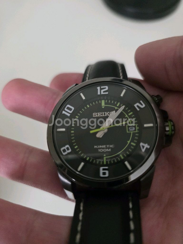 세이코 키네틱 가죽 시계입니다. 반영구적 시계입니다. 가죽밴드는 따로 바꿧고 블랙 색상 가죽 밴드에 녹색 스티치가 포인트로 들어가 있습니다. 배터리 교체 최근에 했습니다. 키네틱이라 가격비싸게 주고 교체한거라 10년이상 문제없다면 쓰실수있을겁니다 캐주얼한 디자인이라 어느 옷에나 잘 어울립니다. 유리 글라스 깔끔하고 생활기쓰외엔 연식대비 상태 좋고 깔끔하게 줄교체 배터리교체한거니 바로 착용하셔도 좋아요