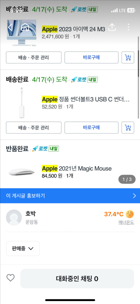 .애플 제품 판매 게시글 캡쳐 이미지입니다 - Apple 2023 아이맥 24 M3(16GB&512GB) - Apple 정품 썬더볼트3 USB C 썬더... - Apple 2021년 Magic Mouse - Apple Care+ 2024년 4월16일 구입 했습니다. 사용감 없습니다. 상태 최상+박스