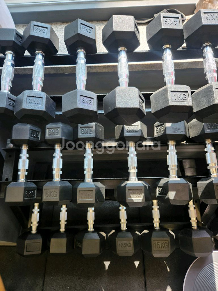 개인정보(거래정보)를 주고받는 행위는 사기에 노출될 수 있으므로 즉시 중고나라로 신고해 주세요육각 덤벨 세트 판매해요 2/3/4/5/6/7/8/10/12.5/15/17.5/20 사진에 보이는 덤벨들은 2kg부터 20kg까지 다양하게 있어요 덤벨 랙도 포함되어 있어서 보관 및 사용이 편리해요 운동 기구로 집이나 헬스장에서 사용하기 좋아요