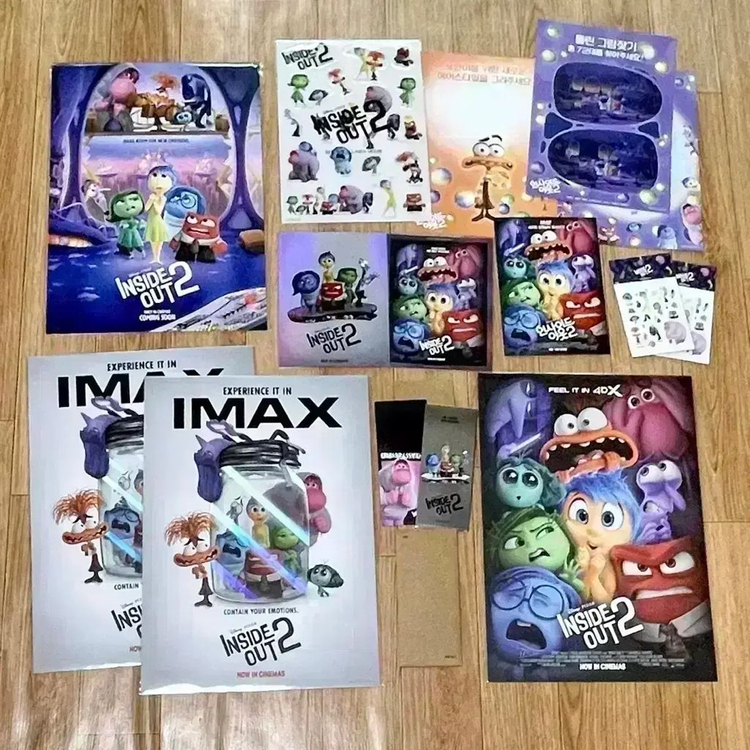 인사이드 아웃2 특전 1주차 아이맥스 포스터 10000 1주차 4DX 포스터 완료 2주차 아이맥스 엠보싱 스티커 9000 스페셜 포스터 14000 오리지널 티켓 12000 아트카드 10000 충청한정액티비티팩(컬러링미로찾기) 5000 TTT, 무비씰, 타투스티커 완료 메가박스 얼리버드 포스터 완료 💜인사이드아웃 굿즈들 3만원 이상 구매 시, A5 캐릭터 엽서 서비스로 보내드려요 알뜰택배 2500 / 일반택배 4500 포장 안전하게 보내드립니다