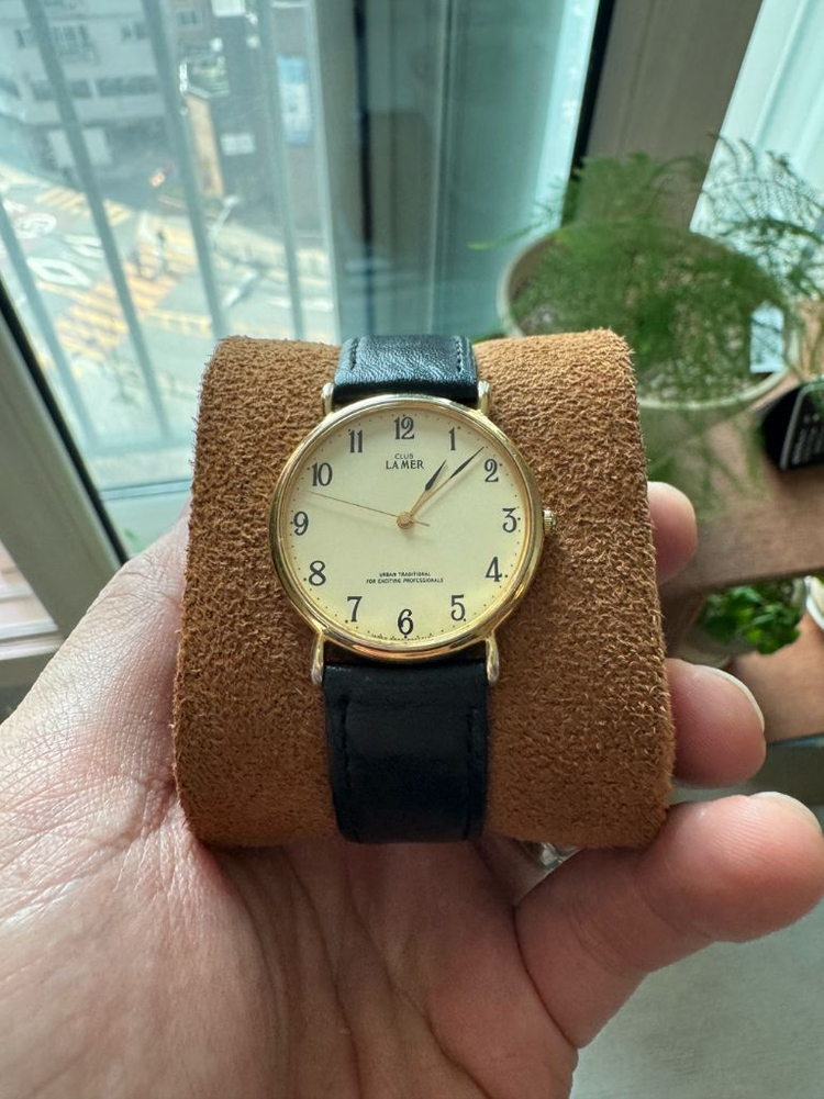 시티즌 Club La Mer 빈티지 드레스 시계 (1985년 / 일본 생산) 시티즌(CITIZEN) Club La Mer 빈티지 드레스 시계 판매합니다. 1985년 생산된 모델로, 케이스백에 KINRO-KANSHA CUP 1985 각인이 있는 일본 기업 기념 시계입니다. 전체적으로 클래식한 디자인이라 정장/캐주얼 모두 잘 어울리는 깔끔한 드레스 워치입니다. 사이즈 : 32-33 미리정도 • 정상 작동 중 • 다이얼 깨끗한 편 • 케이스 사용감 있음 (사진 참고) • 스트랩은 교체된 상태 (소모품)