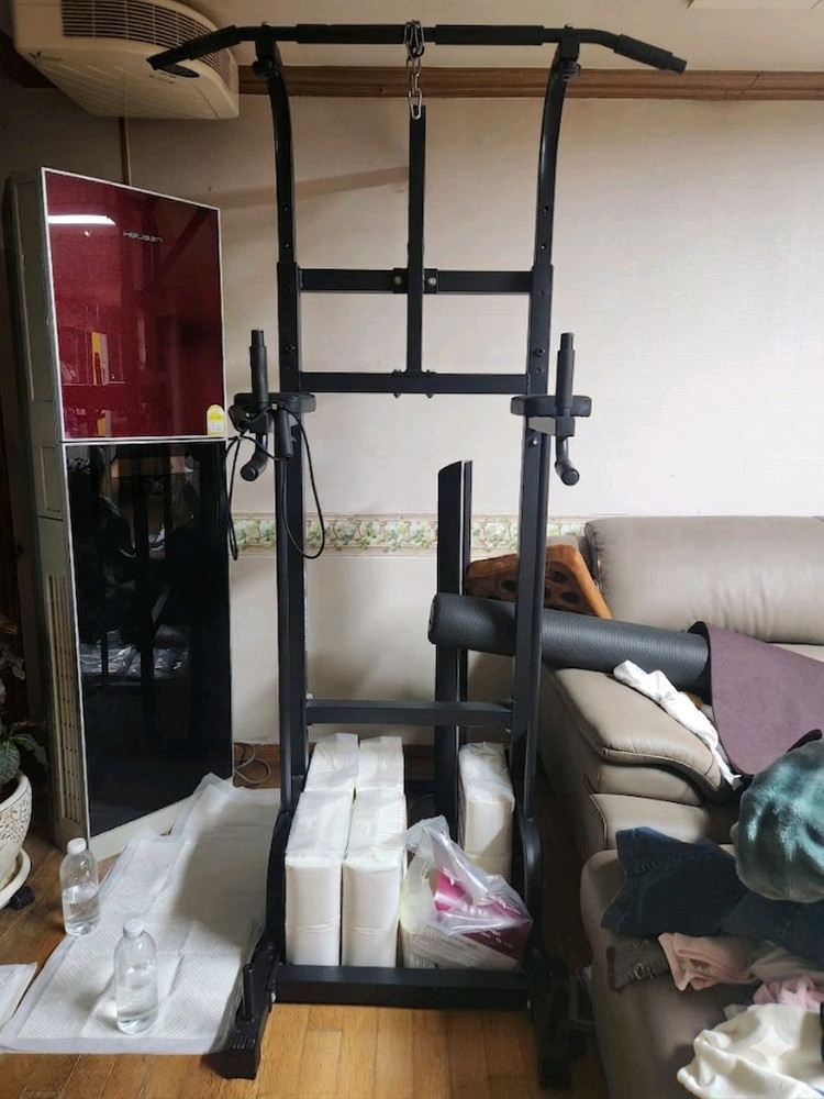 샌드백 + 풀업 샌드백 걸이 사용한지는 4년쯤 되었습니다. 샌드백은 자주 사용한 편이라 하단부 가죽이 일부 벗겨진 상태입니다. 쇠사슬 부분이 살짝 녹이 슬어있으나 전부 멀쩡한 상태입니다. 풀업기구는 생활기스가 조금 있으나 거의 사용하지 않았습니다. 사이즈 가로 110 세로 100 높이 210 정도인 것 같습니다. 일반 가정집에는 충분히 들어갑니다. 35정도에 산 것 같습니다. 오셔서 가져가셔야합니다!