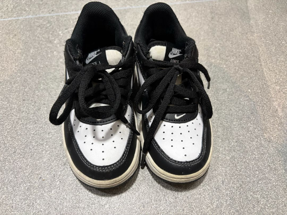 나이키 에어포스 1 키즈 신발입니다 블랙과 화이트 색상 조합으로 어디에나 잘 어울립니다 편안한 착용감을 제공합니다 사이즈는 EUR 28 (UK 10.5, US 11C) 입니다 여아라 5번미만 신겼어요 2만원