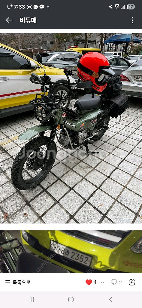 혼다 CT125 헌터커브 올리브색상 모델이에요 사진에서 보이는 그대로의 상태이며, 다양한 옵션이 장착되어 있어요 출퇴근용이나 근거리 여행용으로도 안성맞춤인 바이크랍니다 스타일리시한 디자인으로 어디서든 시선을 사로잡을 거예요 2023년식. 2700km + 좌꿍 1회 ㅠㅠ ! 살짝슬립 튜닝 깔끔하게 잘됬어요. 010 3948 19구사 용산역 직거래 프론트 리어 신코타이어 3.0 디아블로휀더 인디게이터 (공장장님 제작 현재 제작 x 핸들업키트 라이트가드 정품 프론트 캐리어 정품 센터캐리어 (가방포함) 우일리어캐리어 버스크핸들가드 레이노위크 리어가방 사이드가방 (제품명 모름) 머플러 블랙도장 로우시트 작업 2cm 정도 흡기홀 작업 usb 순정짐대보유 싸게 날립니다 ~
