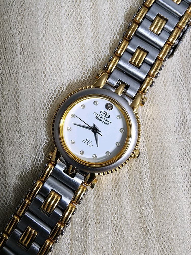 로베르타 앰버서더 골드 콤비 여성시계입니다. 실버와 골드가 적절히 조화된 디자인이 고급스러워요. 다이얼에 큐빅이 박혀있어 더욱 화려합니다. 보관만 해온 제품이라 미세기스 외에는 거의 완벽한 상태의 컨디션을 유지중입니다. ●배터리 교체완료 ●사이즈ㅡㅡㅡ약 25mm 용두제외 구매를 원하시면 안심결제를 이용하여 언제라도 결제하시면 됩니다.
