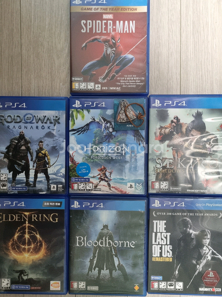 개인정보(거래정보)를 주고받는 행위는 사기에 노출될 수 있으므로 즉시 중고나라로 신고해 주세요PS4 게임 타이틀 판매합니다 - 스파이더맨 GOTY 에디션 2.0 - 갓 오브 워 라그나로크 2.5 - 호라이즌 포비든 웨스트 2.0 - 세키로 4.0 - 엘든 링 X [구매완료] - 블러드본 1.5 - 라스트 오브 어스 리마스터 1.0 택배비 3천원 별도로 받아요 010-3공3팔-육221 직거래는 증산역