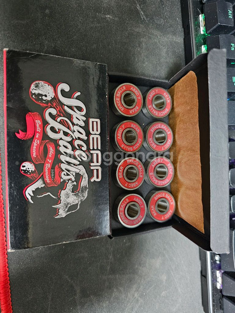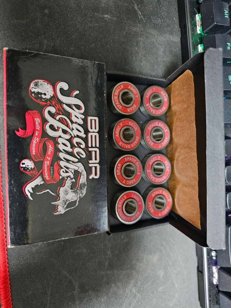 Bear Space Balls ABEC7 베어링 8개 세트 판매합니다. 608 규격(8x22x7mm)이고 표준 8mm 액슬 롱보드/스케이트보드용입니다. built-in spacer 타입이라 별도 스페이서 없이 쓰는 모델입니다. 일부 10mm 트럭에는 맞지 않습니다. 부드러운 주행감을 선사하는 베어링으로, 라이딩의 즐거움을 더해보세요