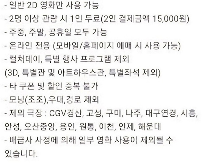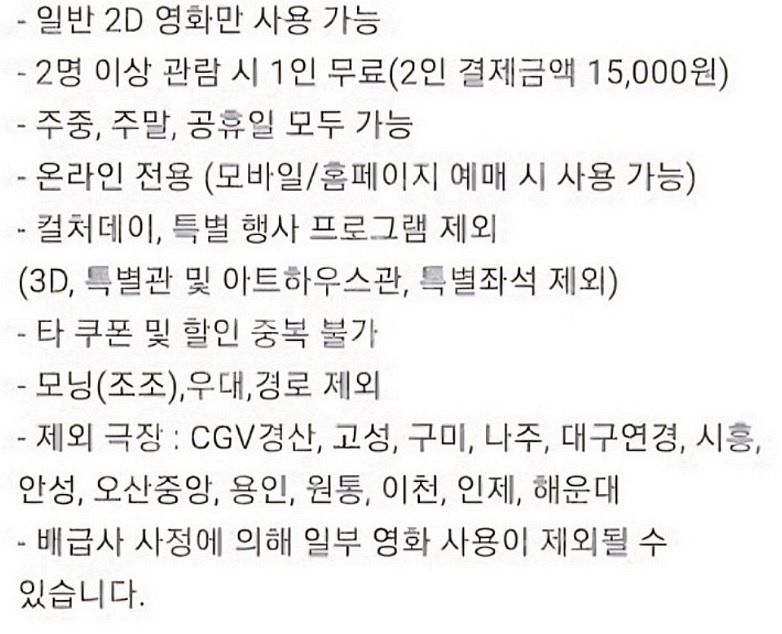 개인정보(거래정보)를 주고받는 행위는 사기에 노출될 수 있으므로 즉시 중고나라로 신고해 주세요신세계 CGV 2D영화 예매 1+1, 콤보50% 할인쿠폰 판매합니다 이미지에 설명 나와있습니다 수량: 1장 유효기간: 26/04/30