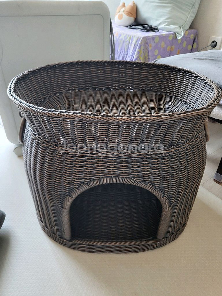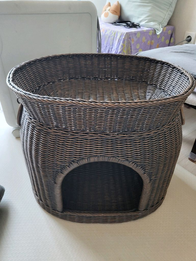 발리등공예 라탄 고양이 숨숨 집 54×43×43H 쿠션없이 본체만 한쪽 손잡이 고리부분이 깨져서 싸게 내놓아요 산지는 꽤 돼서 생활기스나 먼지 좀 있을수 있지만 전반적으로 상태 나쁘지 않은편 아이는 전염성 병력 없고 실사용 별로 안한편 무겁진 않은데 부피가 커서 집근처로 오셔서 직접 가져가심 좋겠어요 용인 수지 풍덕천동입니다