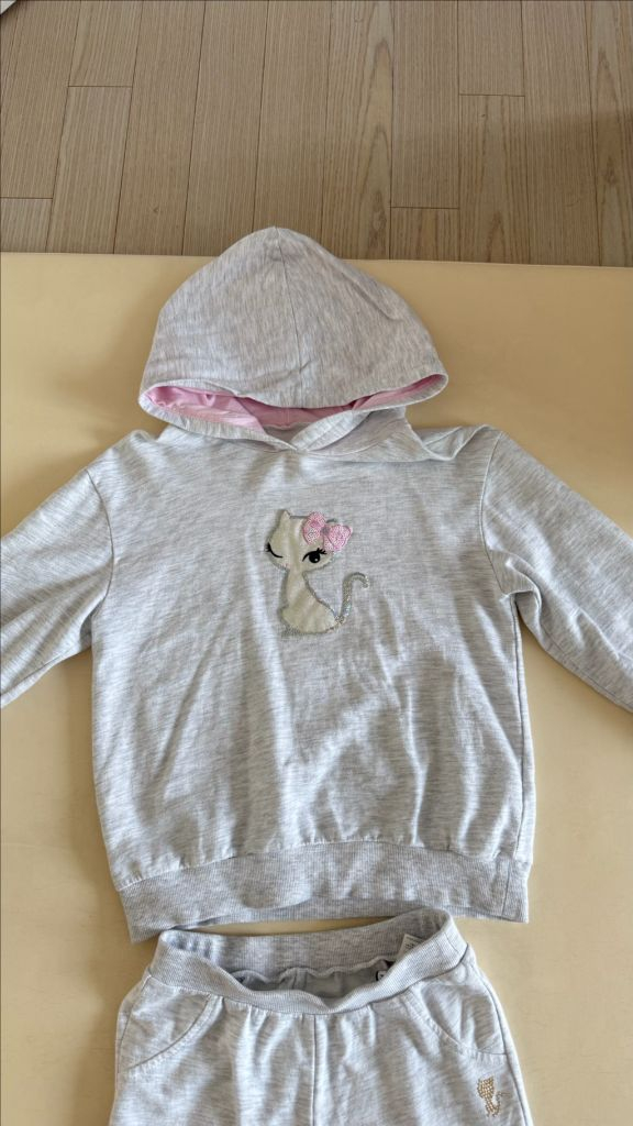 개인정보(거래정보)를 주고받는 행위는 사기에 노출될 수 있으므로 즉시 중고나라로 신고해 주세요귀여운 고양이 프린트가 있는 아동용 운동복 세트예요. 상의와 하의로 구성되어 있고 상태 양호합니다. 145사이즈로 활동하기 편한 디자인이에요.