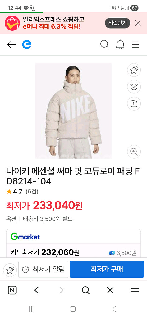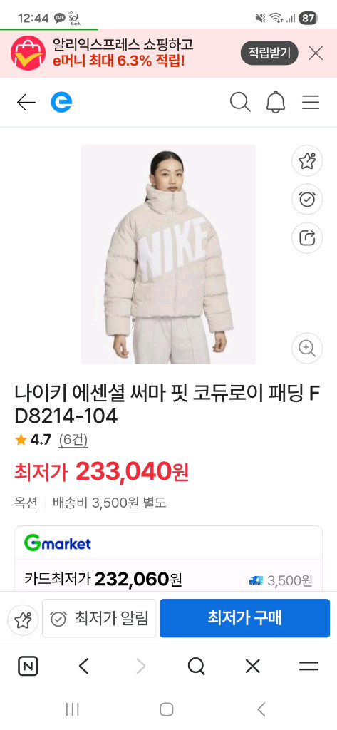나이키 여성 써마 핏 코듀로이 패딩 M사이즈입니다 - 겉감은 면 100%, 안감은 폴리에스터 100%로 제작되었어요 - 충전재는 오리 솜털 85%와 깃털 15%로 구성되어 따뜻합니다 - THERMA-FIT 기술이 적용되어 보온성이 뛰어납니다 2회착용 후 세탁 보관중이에요 상태좋아요