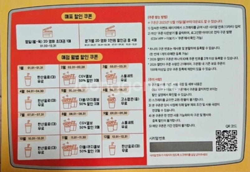 ※ 삽니다 ※ CGV 2026 짱구캘린터 폭망하여 재고떨이로 1만원대에 판매했는데 캘린더 쿠폰이 내장되있는데 평일 쿠폰에다가 영양가 없는 할인권 위주라 인기없죠ㅠ 이 또한 한번 등록하면 3자에게 팔기 어렵습니다 등록전이라면 시리얼번호만 스크래치부분만 긁어 주시면 다 사겠습니다. 일하느라 답장이 조금 늦을 수도 있지만 꼭 답장드릴테니 좋은거래 부탁드립니다 감사합니다