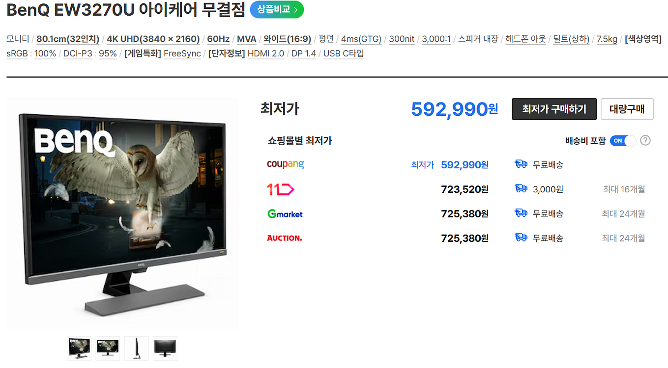 메인모니터로 쓰던건데 다른 모니터로 바꾸게 되면서 판매합니다 고장, 문제 이런건 아예 없습니다 지금도 사용중인 모니터예요 택배거래는 힘들고 직거래만 가능합니다 자세한 주소는 거래 확정시 알려드려요 자세한 사양은 검색해보시면 나옵니다 벤큐 32인치 모니터 BenQ EW3270U 아이케어 무결점 4K UHD(3840 x 2160) 입니다